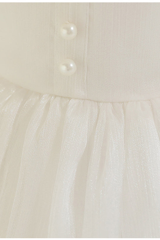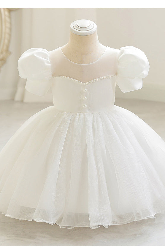 Puff Sleeves White Mesh Birthday Dress with Pearls