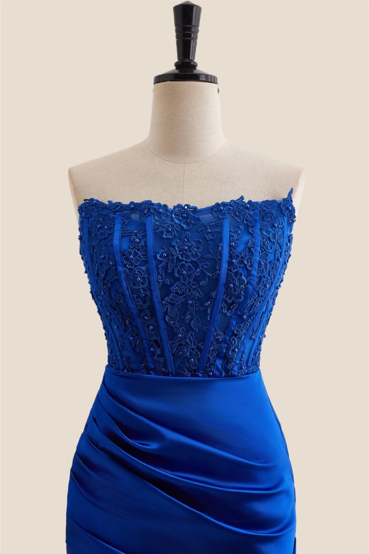 With a stunning royal blue color, bodycon silhouette, and elegant corset bodice adorned with appliques, you'll be the center of attention. The ruched details and built-in bra add extra support and shape while the zip-up back ensures a perfect fit. And at above knee length, this dress is perfect for any occasion.Â