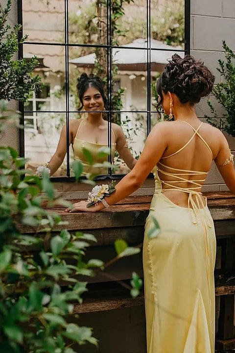 Yellow Sleevelesss Spaghetti Straps Square Mermaid Prom Dress - liymcdress